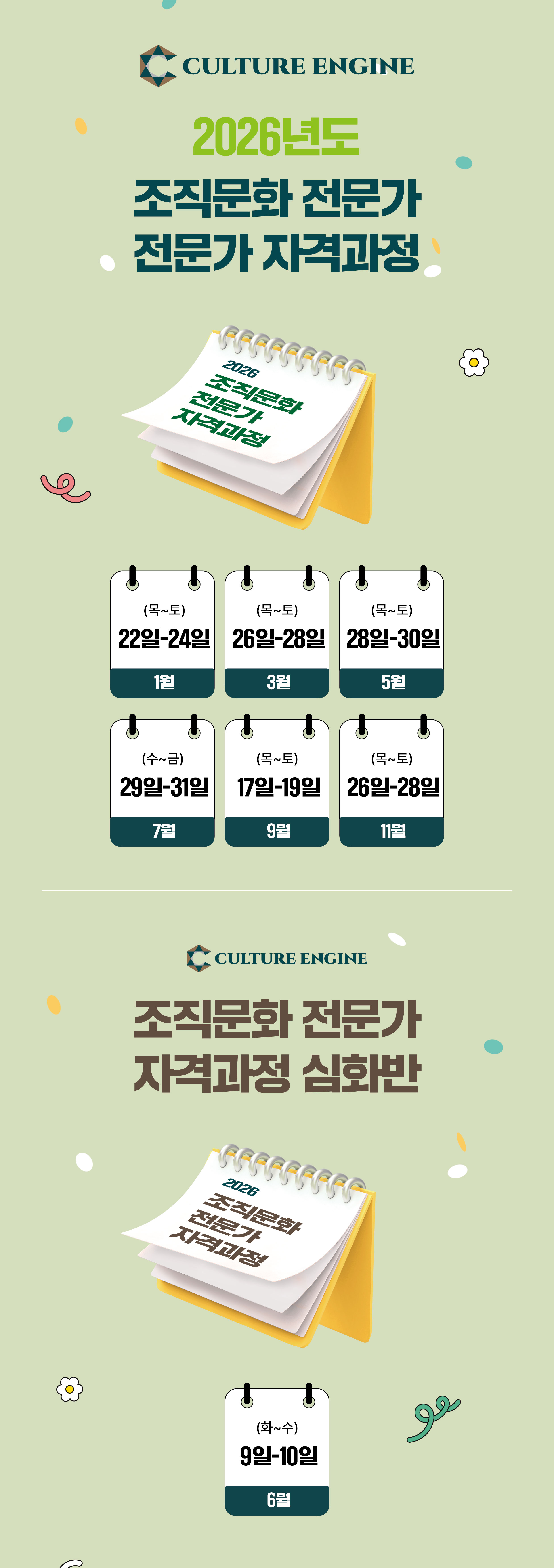 이에 조직 개발 전문 기업인 컬쳐엔진이 조직문화의 시작과 끝을 학습할 수 있는 자격 과정을 준비하였습니다.